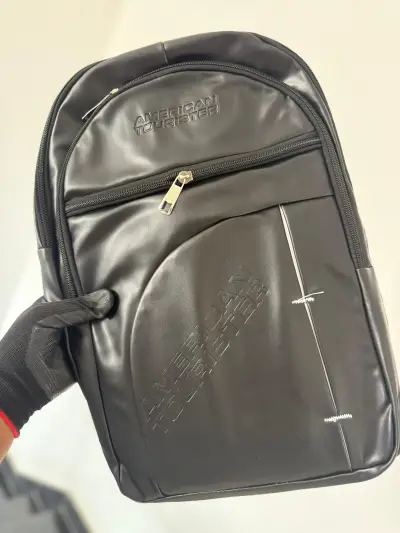 Premium quality American Tourister leather-look backpack with multiple compartments, durable zippers, and sleek design. Ideal for daily use, office, school, and travel.
